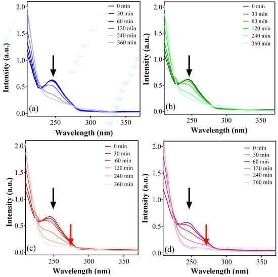 Absorption spectra as a function of electrolysis time during the EO of 30 mg L−1 of ACT at DSA by applying different j: (a) 30, (b) 60, (c) 90, and (d) 120 mA cm−2. Operating conditions: 0.5 M Na2SO4 and 25 °C. Black and red arrows in the UV-vis spectra (a-d) indicate the bands related to ACT (245 nm) and to a by-product (275 nm), respectively.