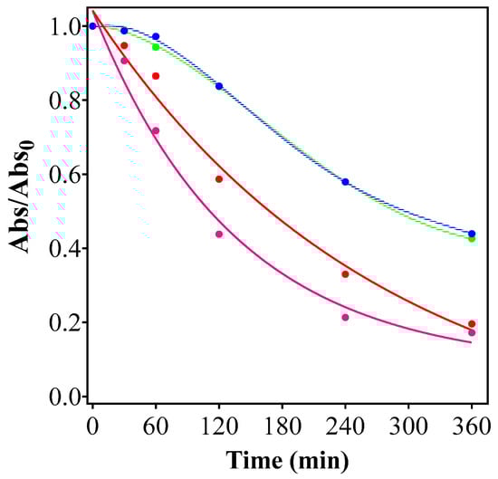 The influence of the j on the degradation of ACT with the BDD anode is shown in Figure 4. These results indicate that the degradation of ACT occurred in 30 min of electrolysis. Comparing the absorption spectra obtained with DSA electrolysis with those achieved with BDD, it is possible to observe that, with the former, the characteristic ACT absorption band was gradually reduced, whereas it quickly disappears at all j values after 5 min of electrolysis with the latter. Unlike DSA, the BDD anode is considered a non-active electrode, therefore, organic compounds are quickly oxidized by free hydroxyl radicals produced at the diamond surface [,,,,]. This follows the results observed in Figure 2, as the oxygen evolution potential of the non-active anodes has a potential greater than that presented by active electrodes (see Figure 2). Thus, the evolution of oxygen is slower at this type of electrode, and consequently, the production of hydroxyl radicals is significantly favored, which accelerates the oxidation process [,,,]. Nevertheless, it is important to remark that the use of BDD as an anode and the significative concentration of sulfate ions in solution, due to the electrolyte, promotes the electrosynthesis of sulfate-based oxidants (ion sulfate radical (Equation (5)) and persulfate (Equations (6) and (7)) []) that participate in the indirect oxidation of the organic compounds [,,,,].