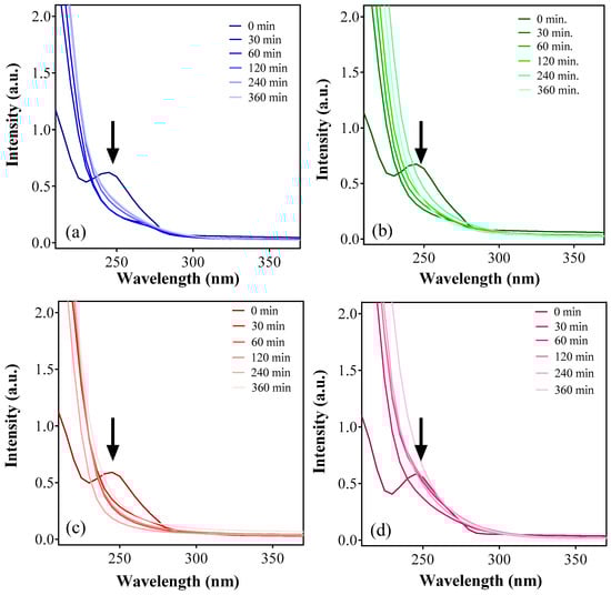 Absorption spectra as a function of electrolysis time during the EO of 30 mg L−1 of ACT at BDD by applying different j: (a) 30, (b) 60, (c) 90, and (d) 120 mA cm−2. Operating conditions: 0.5 M Na2SO4 and 25 °C. Black arrows in the UV-vis spectra (a-d) indicate the bands related to ACT (245 nm).