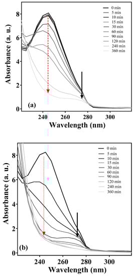 Figure 5 shows the absorbance spectra for removing ACT at a concentration of 300 mg L−1 by applying 90 mA cm−2 as a function of electrolysis time using the DSA and BDD electrodes. As illustrated in Figure 5, on the one hand, the absorption band at 245 nm decreases at both EO-based processes, but it quickly decays at the BDD anode rather than the Ti/TiO2-RuO2-IrO2 anode. On the other hand, the increase in the initial ACT concentration promotes the generation of the by-product at both anodes, and a new absorptive band appears at 275 nm, as described in Figure 2, consequently requiring a greater degradation of the organic compounds present there [].