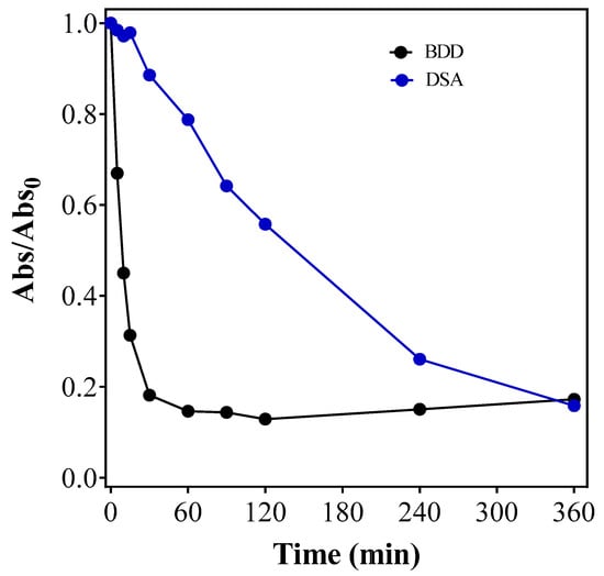 Figure 6 depicts a comparison between the DSA and BDD performance in removing ACT with EO treatment at 90 mA cm−2. In this way, it is evident that after 5 min of electrolysis using the BDD anode, substantial removal is achieved, while DSA gradually eliminates ACT until 360 min.