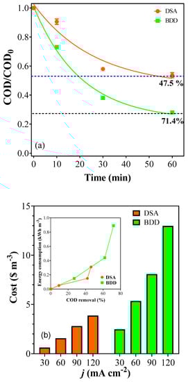 After analyzing the performance of the EO of synthetic ACT effluent by applying 90 mA cm−2, the effect on the increase of the ACT concentration demonstrated that the cost of the treatment increases as a function of j (Figure 7b), being more significative when BDD was used as an anode [,,,]. Another feature is that it is clear that even when the BDD anode promotes better results, achieving higher COD removal efficiencies, the DSA electrode requires lower energy consumption (inset in Figure 7b). However, 60% COD removal could be achieved under the described operating conditions at the BDD anode with modest energy requirements, and a post-treatment could be applied [].