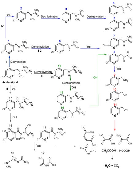 Based on the existing literature, hypothetical degradation pathways of ACT during the EO process were proposed from the 19 degradation intermediates identified by Yao and co-workers [] when a Yb-doped PbO2 electrode was used in 0.05 mol L−1 Na2SO4 solution. The three degradation pathways proposed (demethylation, decyanation, and hydroxylation) were identified as I, II, and III sub-routes according to the different initial attacking ACT positions on three active functional groups by hydroxyl radicals (Figure 8) []. Sub-route I was divided into I-1 and I-2 degradation pathways that correspond to dechlorination and demethylation starting reactions, respectively, with successive steps (Figure 8).