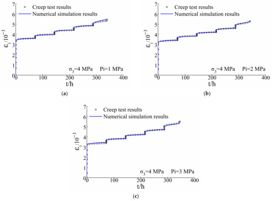 It can be seen from Figure 1 that the creep mechanical behavior of granite gneiss under different seepage pressures can be well described. The numerical simulation result based on the hydro-mechanical properties creep damage coupled constitutive model is in good agreement with the corresponding experimental results. Granite gneiss is a homogeneous rock material with consistent triaxial mechanical behavior under the same conditions. The model parameters in Table 2 are determined by the basic mechanical properties of granite gneiss and do not change with external force conditions, only related to the mechanical properties of the rock material itself. From the simulation results, it can be seen that this model is suitable for simulating the creep mechanical behavior of granite gneiss under the coupling effect of hydro-mechanical properties. Mansouri et al. [30] and Firme et al. [31] simulated salt rock by establishing corresponding constitutive models, defined parameters based on different rock material properties, and simulated them. The simulation results were good, which is consistent with the phenomenon presented in the manuscript. In general, the coupled constitutive model of rock hydro-mechanical property creep damage can accurately describe the instantaneous damage, time-dependent damage and creep deformation characteristics of rocks under the coupling effect of hydro-mechanical properties, further verifying the accuracy of the theory and simulation of this model.