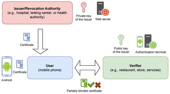 Our cryptographic core is based on using the Fast Keyed-Verification Anonymous Credentials (FKVAC) [21]. Similarly to the FKVAC scheme, our scheme employs the weak Boneh–Boyen (wBB) [23] digital signatures to create the cryptographic credentials over user attributes. In contrast to the FKVAC scheme, our scheme offers to separate the cryptographic keys of the VER and the I/RA, resulting in an asymmetric cryptographic scheme. This way, it can be used in the application scenario of EU Digital Vaccine Certificates, where the VER and the I/RA are distinct entities which have different rights to the users’ data. All this is performed, while ensuring the same (i.e., low) computing, memory, and cryptographic requirements on the user side (where users have an authentication device in the form of a smartphone or smart card). The system architecture of our solution is shown in Figure 1.