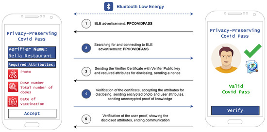 The communication model for presenting the vaccination certificate is shown in Figure 2. The USR is equipped with a smartphone capable of Bluetooth Low-Energy (BLE) communication. The service provider (acting as the VER) broadcasts the BLE advertisement (named, for example, PPCOVIDPASS). If the USR is interested in using the services of the service provider, it initiates a search and connection process through the BLE advertisement. The USR’s mobile app will then connect to the VER app, and both apps will exchange verification data. Namely, the VER sends the verifier certificate with the verifier public key and required attributes for disclosing and cryptographic nonce. Note that the verifier certificate is signed by the I/RA, which is trusted by both communication parties. The USR’s app verifies the validity of the certificate, i.e., the validity of the generated I/RA signature. If the signature is valid, the USR decides whether to accept or decline the attributes required by the VER. If the user approves the attributes, the app sends an encrypted USR’s photo (one of the user attributes), other required attributes (such as, for example: Dose number, Date of Vaccination), and unencrypted proof of knowledge of hidden attributes. In case of successful verification of the presented attributes and identification of the person presenting these attributes by the VER, the USR is granted access to the service; otherwise, it is denied.
