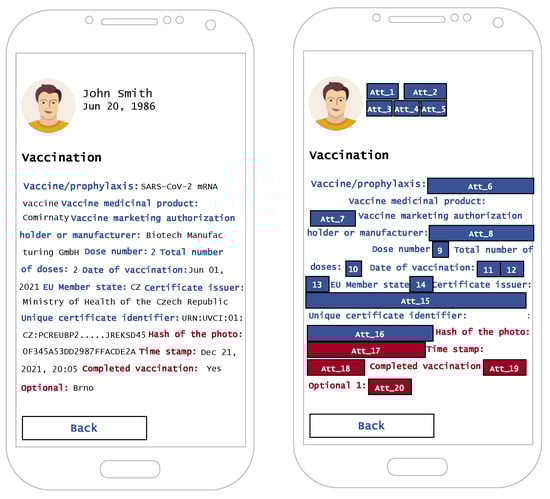 The detailed structure of the digital vaccine certificate, including the representation of individual attributes, is shown in Figure 3. The cryptographic credential contains a total of 20 attributes. However, it can be expanded if it is needed. The first 16 attributes correspond to the attributes from EU Digital Vaccine Certificate. The following attributes extend the certificate by (1) a photo of the certificate holder enabling the connection of the holder with the certificate, (2) time stamp, (3) information about the completed vaccination (i.e., yes, no), and (4) one optional field according to the needs of the service provider.