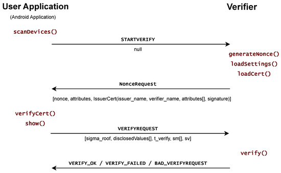 The first message carries the string STARTVERIFY. In response to receiving this message, the verifier’s terminal responds with a message of the data type NonceRequest. The message thus carries a challenge, a list of attributes to reveal, and the verifier’s certificate. The verifier’s certificate is used to verify the identity of the verifier, verify what attributes are to be disclosed to the verifier, and whether the verifier has the right to query those attributes. The certificate is verified upon receipt of the NonceRequest message, and the requested attributes are compared against the allowed attributes. Once the user decides to proceed with the verification process, the cryptographic proof is generated and sent to the verifier along with the revealed attributes. The sending of this message is signaled by including the string VERIFYREQUEST at the beginning of the message before the proof in the form of the data structure VERIFYREQUEST. When the message is received by the verifier device, the proof is verified. Based on the result of this verification, the final user–verifier communication message is produced. The final message may take the form VERIFY_OK if the authentication is successful. If the verification fails, a message VERIFY_FAILED or BAD_VERIFYREQUEST is sent. The first message indicates that the verification failed. The second message indicates that a communication error occurred and the user is prompted to resend the third message of the protocol.