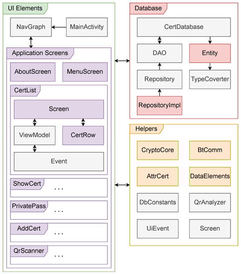 The Android mobile application is built upon the Model–View–ViewModel (MVVM) architectural pattern and implemented using modern technologies such as the Kotlin programming language, local Room database, and Jetpack Compose framework for rendering the user interface. The application is composed of user interface elements, database access classes, and support classes providing communication and cryptographic core functions. The interrelation of these elements is illustrated in Figure 8.