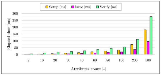 To measure the time consumption of our algorithms, we developed a test application in the Java programming language that does not perform any communication overhead between system entities (i.e., issuer, user, and verifier). Each algorithm of the cryptographic core runs in this test application. Therefore, saving and loading of individual parameters was not performed. The application implements the cryptographic core listed in Section 7.1. The application uses the measureTimeMillis() function to measure the elapsed time of each algorithm. This feature allows us to measure Central Processing Unit (CPU) time with millisecond accuracy. Our experimental results are presented in Table 1 and Figure 9. The measurements confirmed the expectation that the time requirement of the algorithm increases with the number of hidden attributes. To make the experimental results more indicative, we performed all tests with all hidden attributes except the first attribute that was revealed. The most computationally demanding algorithm is the Verify algorithm. However, even when revealing a theoretical number of 500 attributes (which is a highly inflated value) from a cryptographic credential, the required time reaches less than 300 ms. Therefore, the measurements show that the cryptographic core does not represent any performance issue on current smartphone platforms.