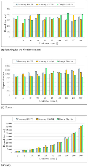 In addition, we also evaluated the computational complexity of our application in the case of revealing a theoretical number of 500 attributes (which is a highly inflated value) from a cryptographic credential: see Figure 11. The required verification time, including the BLE communication overhead, takes up to 3 s for most of the tested smartphones. The measurements therefore show that our application can be practical even in the case of a high number of attributes contained in the cryptographic credentials.