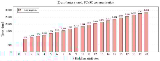 To evaluate the performance of our privacy-preserving digital vaccine certificate on the smart card platform, we used the MULTOS-based smart card implementation from our previous work in [21,27]. The Show-Verify algorithms were implemented using Barreto–Naehrig (BN) BN254 elliptic curve from the MCL library [25]. Only standard Multos API and free public development environment (Eclipse IDE for C/C++ Developers, SmartDeck 3.0.1, MUtil 2.8) were used. In the case of using smart cards for storing and presenting certificates, the verification time (in the worst case, i.e., 20 stored attributes, all hidden) can be expected to be up to around 3 s as shown in Figure 12. Since smart cards do not support BLE communication, it would be necessary to use Personal Computer/Smart Card (PC/SC) and contact/contactless communication interface.