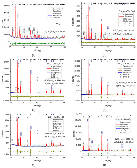 As is known, the most widespread method of producing functional ceramics is solid-phase synthesis using oxides, which includes co-milling of the initial reagents, pressing, and sintering [17,18]. However, other reagents, such as carbonates, are often used in ceramic technology to control shrinkage and pore formation [19,20,21]. To unambiguously evaluate the suitability of ceramics for inert matrices, high-cost experiments with the irradiation of heavy ions in ion beam accelerators can be performed [22]. Prior to this test, standard material characterization must be performed. The purpose of this paper is to investigate the mechanical and electrical properties and structural features of high-content cubic zirconia ceramics obtained via solid-state sintering. Through a detailed analysis of how the doping of zirconium oxide with CaCO3 affects the lattice parameters, phase composition, particle size, microhardness, and dielectric properties of sintered ceramics, a preliminary estimation of its applicability in nuclear power as inert matrices was performed.