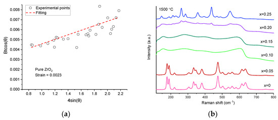 The results of the calculated values of the lattice parameters for the measured diffractograms are given in Table 1 and Table 2. The observed increase in the lattice parameter and volume in the cubic phase suggests that the incorporation of Ca2+ ions, which have a larger ionic radius, into the ZrO2-m structure leads to two significant outcomes. Firstly, it induces the transition of the monoclinic phase into the cubic phase. Secondly, it causes the expansion of the cubic unit cell. In the case of the ZrO2-m phase, the unit cell volume decreases with increasing dopant concentration owing to the decrease in parameters a and b. The highest values of the unit cell volume and parameters a and b for the undoped sample can be attributed to the tensile stresses developed after cooling. To confirm this hypothesis, the Williamson–Hall method was applied to an undoped sample to determine the type of stress (compressive or tensile) from an analysis of the diffractogram peaks. [31]. The FWHM (Full Width at Half Maximum) and the peak center of the most prominent reflections were determined using Profex 5.0.2 software. Figure 2a shows that the approximation line has a positive slope, indicating tensile stresses. Thus, it can be stated that the increased value of the lattice parameters in the undoped ceramics is due to tensile stresses. These stresses arise during cooling, when a transition from the tetragonal phase to the monoclinic phase occurs.