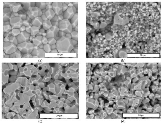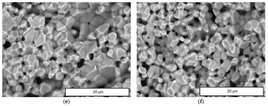 The obtained ceramic tablets were investigated via X-ray powder diffraction (XRD) using a D8 Advance Eco diffractometer (Bruker GmbH, Mannheim, Germany), Raman spectroscopy using an Enspectr M532 spectrometer (Spectr-M LLC, Chernogolovka, Russia), and dielectric spectroscopy using a HIOKI IM3533 LCR meter (HIOKI E.E. Corporation, Ueda, Japan). To perform dielectric measurements, silver paste was applied to both sides of the tablet surface to create a plain capacitor structure. Micrographs were taken on cross-sections of the tablets using a Hitachi TM 3030 scanning electron microscope (SEM) (Hitachi Ltd., Tokyo, Japan) at an accelerating voltage of 15 kV. Elemental analysis and elemental mapping were performed using a Quantax 70 unit (Bruker GmbH, Mannheim, Germany). The morphological parameters (the grains’ size and distribution) were evaluated using ImageJ software 1.54f. Before grain size calculation, the digital images obtained via SEM were adjusted to obtain a clear, high-contrast view of the grains. After that, automatic and manual defining of the grain outlines with calculation of the Feret diameter were carried out. The microhardness of the obtained ceramics was determined using the Vickers method with a diamond indenter on a METKON Duroline-M microhardness tester (Metkon Instruments Inc., Bursa, Turkey) under a load of 0.2 kgf at a dwell time of 10 s. Before the hardness test, the surface of the tablets was gently ground and polished according to the procedures in DIN EN ISO 6507-2:2018 [23] and ISO 14705:2016 [24].