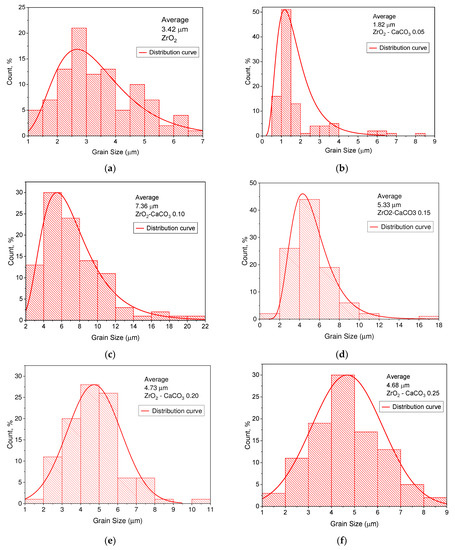 Samples with dopant concentrations of Cw = 0.10 and 0.15 (Figure 4c,d) exhibited large ranges of grains size, spanning from 0 to 22 μm. This indicates the occurrence of intensive processes of grain coalescence and coarsening during annealing [35]. These samples were characterized by the highest values of the fraction of the cubic phase (Table 3), signifying the decisive contribution of phase transformations during atomic diffusion to grain growth [36]. However, with increasing concentration, a decrease in the grain size range and average grain size were observed. This can be attributed to the large concentration of CO2 gas released during annealing, which forms pores. The presence of pores is a critical factor in the further densification of ceramics due to the grain growth [27]. For this reason, for concentrations of 0.20 and 0.25 (Figure 4e,f), despite the intense coalescence and expansion of grains, the average grain size and distribution range decreased. It can also be argued that the CaCO3 in the charge is a pore-forming agent and significantly affects the microstructure of zirconia ceramics.