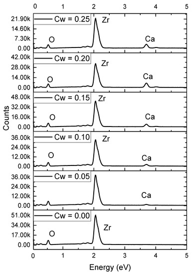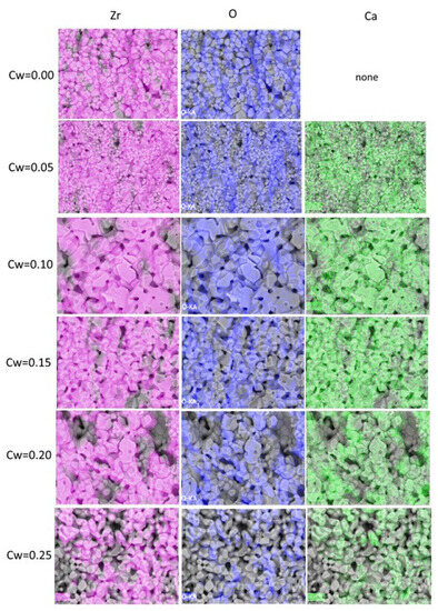 Figure 5 shows the spectra of the energy-dispersive analysis of the obtained ceramics. The spectra suggest that the synthesized samples contained only Ca, Zr, and O. With increasing dopant concentration, the intensity of the peak related to Ca increased, indicating an increase in the concentration of this element in the ceramic composition. The chemical composition of the obtained samples is shown in Table 4. The analysis of the peaks using Quantax 75 software over the scan area shown in Figure 6 demonstrates that the atomic percentage of Ca increased with increasing Cw. The discrepancy between the atomic percentages and stoichiometric formulas can be explained by the large degree of roughness of the cross-sections. This roughness makes it difficult to detect X-ray photons, which can change the atomic composition from stoichiometric. Elemental mapping of the cross-section of the ceramic sample showed that oxygen and zirconium ions were uniformly distributed over the ceramic surface. However, for the sample with a concentration Cw = 0.05, it can be observed that Ca ions were distributed predominantly in large grains. Considering the results of the powder diffractogram analysis, it can be concluded that the small grains were predominantly composed of monoclinic phases. In the case of ceramics with high dopant concentrations, the non-uniform distribution is due to the formation of the CaZrO3 phase, which contains more Ca than the substituted ZrO2—c phase.