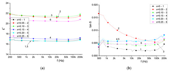 Frequency dependences of dielectric permittivity (a) and loss tangent (b) for the obtained ceramics.