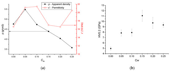 Dependences of apparent density and dielectric constant on mass concentration of dopant (a) and dependence of microhardness HV on dopant concentration (b).
