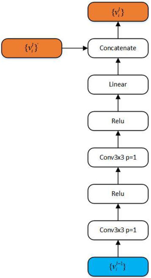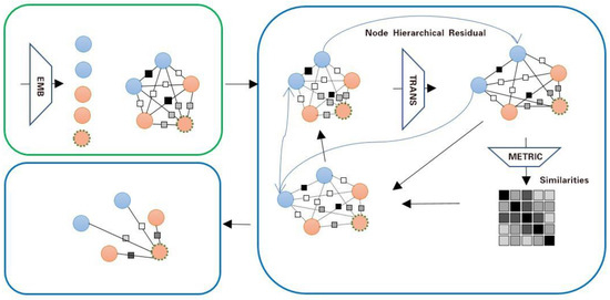 The feature (node) transformation network is represented in the equation by , where the parameter set is denoted by , as shown in Figure 3b. It is vital to highlight that we take into account inter-cluster aggregation in addition to the traditional intra-cluster aggregation. The target node receives “similar neighbor” information from intra-cluster aggregation while receiving “dissimilar neighbor” information from inter-cluster aggregation. The edge feature update is then carried out using the recently updated node features. In order to update the features of each edge, the (dis)similarity between each pair of nodes is computed, and the prior edge feature values are combined with the updated (dis)similarity as follows:
