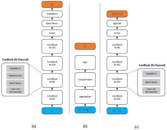 Detailed network architecture used in EGNN + Node Hierarchical Residuals. (a) Embedding network. (b) Feature (node) transformation network. (c) Metric network.