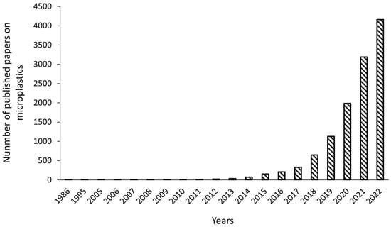 Temporal evolution of microplastics research publications (1986–2022), illustrating a sustained increase in research publications dedicated to microplastics over this period, highlighting a substantial surge in scientific interest.