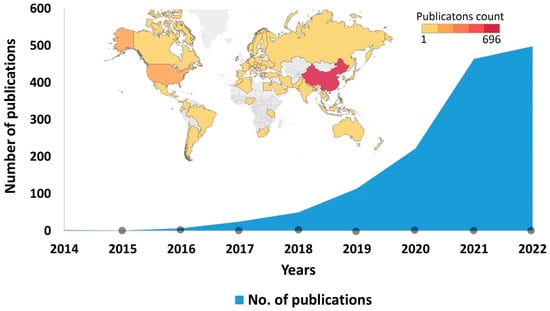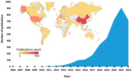 The number of publications published by various nations on the same topics as those mentioned above is shown on the global map (Figure 2). Using the Web of Science Core Collection database, we combed through all 1405 papers published up to 2022. The search pattern included all conceivable permutations of the word associated with each of four land-related terms. The studies were combed for location and publication date information. China is, according to statistics, the leader in microplastics research connected to landfills, followed by the United States of America. It is noteworthy to observe that the number of published research papers on microplastics in soil has risen nearly 20-fold during the last five years.