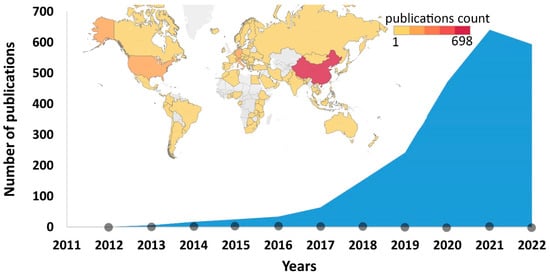 The graph shows the volume of research publications on microplastics related to freshwater, rivers, lakes, ponds, etc., published from 2011 to 2022. The number of publications published by various nations on the same topics as those mentioned above is shown on the global map.
