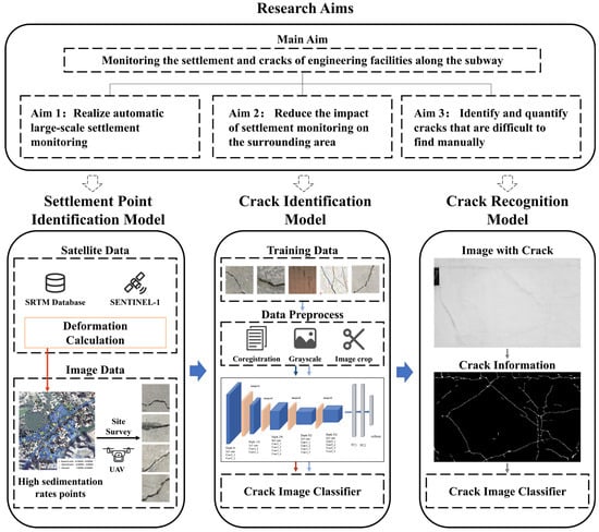 Given the drawbacks of previous studies, such as the difficulty in accurately recognizing cracks in subway environments and the inability to obtain crack information, this study aims to provide a large-area settlement solution based on PS-InSAR technology, considering its ability for monitoring subway facilities with high accuracy over a long period of time. Meanwhile, a crack detection method based on UAVs, deep learning and digital image processing is proposed, which can accurately quantify the length and width of cracks in the complex environment around the subway. The research concept is shown in Figure 1.