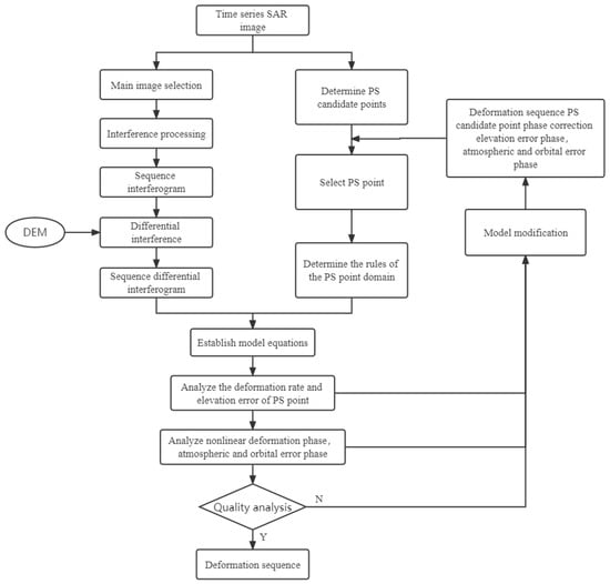 SAR (Synthetic Aperture Radar) is a measurement and imaging technique that uses the phase of coherent radar signals to measure the surface of the terrain, and the variation in surface detail features over time []. In contrast to GPS technology, SAR technology can be applied to an area of about 1000 km2, which is regularly scanned by single or multiple satellites. SAR technology does not need to arrange monitoring points on site, and the monitoring cost is low, while the efficiency is high. However, the temporal and geometric decorrelation of SAR becomes the limiting factor for applying SAR technology in settlement monitoring. In addition, the inhomogeneity of the atmosphere can also strongly affect the accuracy of the results []. Based on the SAR technique, InSAR (Interferometric Synthetic Aperture Radar) time-series technology, a robust measurement remote sensing method for estimating millimeter-scale surface deformation from space, has been developed to solve temporal and geometric decoherence []. Although the interferometric phase can be obtained by using the geometric relationship between the two SAR acquisition points, InSAR technology presents a problem with signal decorrelation. InSAR time-series analysis techniques mainly address signal decorrelation to estimate deformation and atmospheric signals []. These techniques can be divided into three types. The first type, named the D-InSAR technique, separates the phase contribution terms other than the surface deformation phase in the interferometric phase []. The second type is PS-InSAR permanent scatterer (PS) InSAR technology, which mainly analyzes time-coherent point scatters in urban areas []. The PSP-InSAR (persistent scatterer pairs InSAR) persistent scatterer method is a new persistent scatterer interferometry method [].