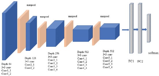 Convolutional neural networks can be used to build a deeper network with a smaller number of parameters, thus reducing the time and computational cost of the training process. VGG16, as a classical convolutional neural network architecture, consists of 13 conventional layers and 3 fully connected layers. It employs small 3 × 3 convolutional kernels and incorporates maximum pooling layers, presenting a relatively streamlined yet deep architectural design, as shown in Figure 3. Consequently, in our crack recognition model, VGG16 was chosen as the classifier to convert the crack detection problem into a binary classification problem and classify the image samples with cracks and no cracks in the image data set.