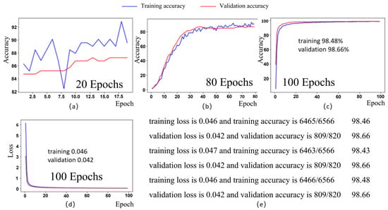 The training results of the model are shown in Figure 4. The convolutional network inputs 8206 images, 6566 images in the training set, and 820 images in the validation set. A batch-size has 64 images, and an echo has a total of 103 batch-sizes. All the data of training set are used for training, and epochs are set to 20, 30, 40, 50, 70, 80, 90 and 100 to find the best trained model. In this study, training loss, validation loss, training accuracy, and validation accuracy are utilized to calculate the accuracy of crack recognition model. When training for 20 epochs, as shown in Figure 4a, there is no convergence trend for training accuracy and verification accuracy. At the 80th epoch, as shown in Figure 4b, the training accuracy has not yet converged but the validation accuracy is close to convergence. As shown in Figure 4c–e, after 100 epochs of training, the training loss and validation loss are 0.046 and 0.042, respectively, the training accuracy of the model converges to 99.48%, and the validation accuracy converges to 98.66%, which is a sufficiently accurate model for subsequent use.