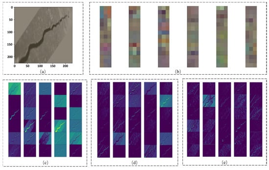 Convolutional neural network visualization: (a) a photo of the crack; (b) convolution kernel visualization; (c) features extracted after convolution layer 0; (d) features extracted after convolution layer 2; (e): features extracted after convolution layer 5.