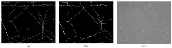 Original crack coverage. (a) shows the comparison of the images before the five morphological manipulations, (b) shows the results of the fifth morphological manipulation, and (c) shows the result of overlaying the cracks extracted from this experiment to the original image, and the white numbers are the numbers of cracks.