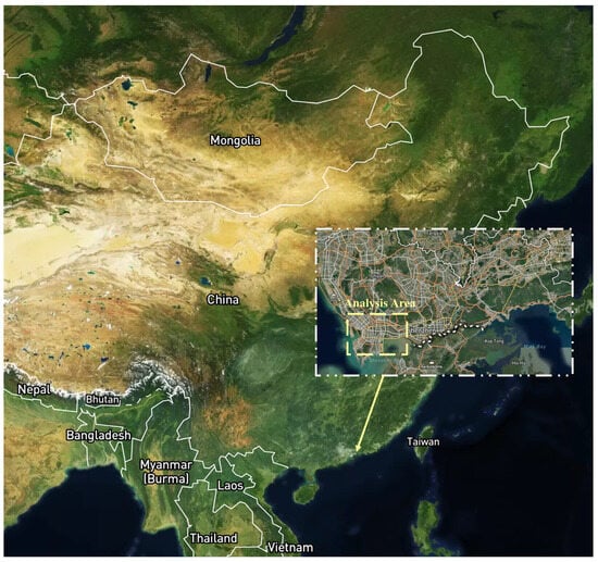 In recent years, the settlement of Shenzhen city mainly occurs in the reclamation area and along the subway, especially near the reclamation area. Located in the Yuehai Street office, Nanshan District, Shenzhen University is one of the most prosperous and populous areas in Shenzhen. The Yuehai campus of Shenzhen University is built in the reclaimed area. Excavation activities for subways in such fragile soil conditions can potentially lead to the movement and alteration of underground soil, causing subsidence in soil layers and affecting surface stability. Additionally, the vibrations and impact forces generated during subway train operations may act upon nearby aging structures, thereby accelerating the formation of cracks. Furthermore, for China, while the actual lifespan of a subway system can indeed be influenced by factors such as construction materials, maintenance practices, and operational conditions, it is generally designed with a structural lifespan of 100 years. In such an extended timeframe, the monitoring of subsidence and cracks becomes an essential concern that cannot be overlooked. Therefore, the settlement of engineering facilities in this area needs more attention. To verify the effectiveness of the proposed settlement and crack monitoring model and explain its operation process, this study takes the Shenzhen University section of Shenzhen Metro Line 9 as an example for case analysis, and the analysis area is shown in Figure 7.