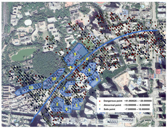Settlement point of engineering facilities along Shenzhen section of Metro Line 9. The yellow numbers 1–11 in the figure are the 11 hazardous and unusual facilities. PS points with a settlement rate exceeding −20.00000 mm/y are called dangerous points, PS points with a settlement rate exceeding −8.000000 mm/y and less than −19.999999 mm/y are called abnormal points, and PS points with a settlement rate less than −7.999999 mm/y are called safe points.