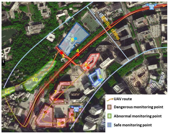 UAV route map. The yellow numbers 1–11 in the figure are the 11 hazardous and unusual facilities.