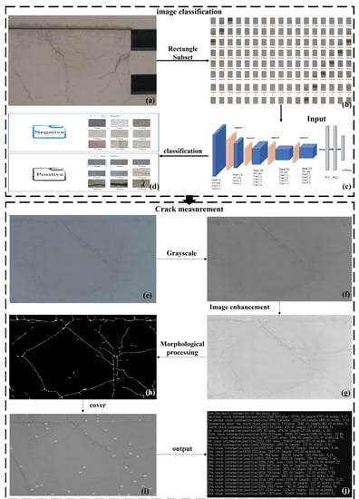 Crack monitoring process: (a) a crack image taken by drone; (b) rectangle cropping images; (c) VGG16 network architecture; (d) images after classified; (e) an image that contains a crack; (f) the crack image after grayscaling; (g) the crack image after image enhancement; (h) the crack image after morphological processing; (i) the overlaying crack image; (j) the output information of crack.