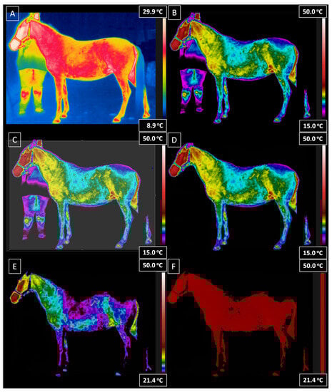 Infrared images of the lateral surface of the horse. (A) Raw image; (B) basic image in Rainbow HC palette with temperature range set between 15.0 and 50.0 °C; (C) image in Rainbow HC palette with marked the highest/maximal temperatures (Tmax) in the horse’s eye area; (D) image in Rainbow HC palette with background masked; (E) image in Rainbow HC palette with temperature range set between Tmax-10 °C and 50.0 °C; (F) image in Gray palette with temperature range set between Tmax-10 °C and 50.0 °C and alarm tool set on Tmax-10 °C limit.