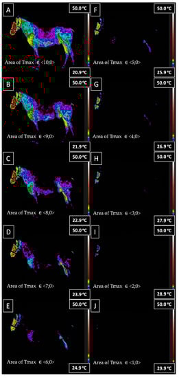 Processed infrared images of the lateral surface of the horse. The area of the highest/maximal temperatures (Tmax) is marked as the multi-colored-annotated area on the Rainbow HC palette images. (A) The ranges for Tmax-10 °C; (B) Tmax-9 °C; (C) Tmax-8 °C; (D) Tmax-7 °C; (E) Tmax-6 °C; (F) Tmax-5 °C; (G) Tmax-4 °C; (H) Tmax-3 °C; (I) Tmax-2 °C; and (J) Tmax-1 °C are marked on the respective images.