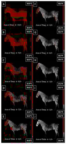 Processed infrared images of the lateral surface of the horse. The area of the highest/maximal temperatures (Tmax) is marked as the red-annotated area on the Grayscale palette images. (A) The ranges for Tmax-10 °C; (B) Tmax-9 °C; (C) Tmax-8 °C; (D) Tmax-7 °C; (E) Tmax-6 °C; (F) Tmax-5 °C; (G) Tmax-4 °C; (H) Tmax-3 °C; (I) Tmax-2 °C; and (J) Tmax-1 °C are marked on the respective images.