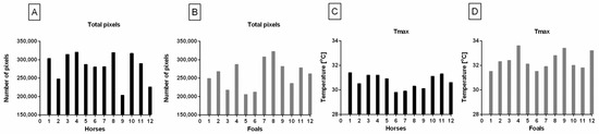 The total number of multi-colored-annotated pixels did not differ between foals and adult horses; thus, further analyses regarding comparisons of transformed infrared images are justified. Although these are still metabolically different groups, measured differences would provide new insights into the mechanisms of transition into developed homeothermy in adults. We have found higher surface temperatures in foals than in adult horses, confirming higher heat energy radiation associated with their higher metabolism related to growth and development, as well as smaller insulation [15,41,42,43]. Smaller insulation also contributed to detection areas with the highest temperature values both in adults and foals [3,21,30]. Although data regarding surface temperature in foals are scarce, it is well known that other temperature measurements confirm a higher physiological temperature in foals than in adult horses [10,40,41]. Therefore, to the best of our knowledge, this is the first report comparing IRT features, both conventional Tmax and novel Area Tmax, between adult and young horses.