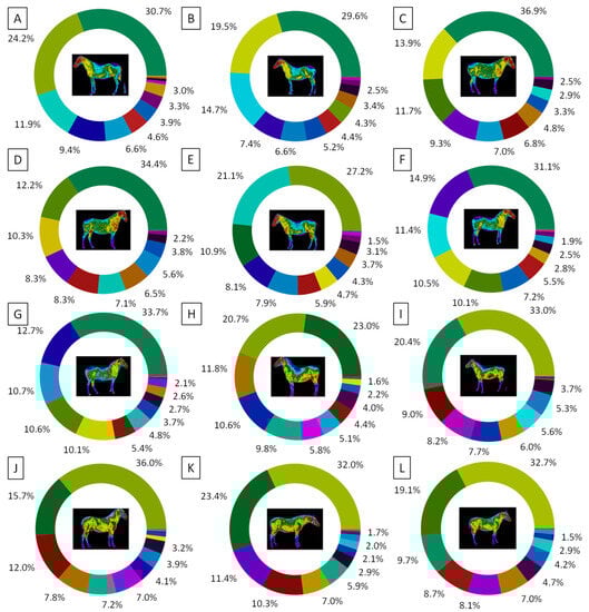 The main colors detected in the infrared images are presented in Figure 5 and Figure 6. In the horse group, pixels in shades of dark green (Figure 5A–D,F–H) and light green (Figure 5E,I–L) were most frequently detected. Pixels in shades of light blue (Figure 5A,B,E) and dark blue (Figure 5F,G) were less common. In the foal group, pixels in shades of green, both dark and light, were most prevalent (Figure 6A,B,E,F,I–L), whereas pixels in shades of blue were detected less frequently (Figure 6C,D). In both groups, pixels in shades of red, purple, and orange accounted for a smaller percentage. However, there was no significant difference in Total pixels between the horse and foal groups (p = 0.17; Figure 7A).