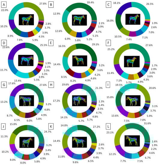 The percentage of pixels belonging to individual HEX colors detected on the foals’ body surface. Subsequent foals were considered separately as individuals 1–12 (A–L). Percentage of pixels < 1.5% is not displayed.