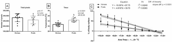 (A) The total occurrence of multi-colored-annotated pixels (Total pixels) and (B) the highest/maximal temperatures (Tmax) compared between horse and foal groups. Data in bar graphs were represented as the mean + SD. Additionally, values for subsequent individuals were marked with dots. Lowercase letters indicate differences between the horse and foal groups for p < 0.05. (C) Comparison of Total pixels detected in the horse and foal groups throughout ten Areas of Tmax ranging from Tmax−10 °C <10, 0> to Tmax−1 °C <1, 0>. Similarity was tested using linear regressions and considered significant for p < 0.05. The t-value and df are displayed on the plots (A,B).