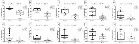 The percentage of red-annotated pixels (Red pixels) occurrence in the Areas of the highest/maximal temperatures (Tmax) ranged for (A) Tmax-10 °C; (B) Tmax-9 °C; (C) Tmax-8 °C; (D) Tmax-7 °C; (E) Tmax-6 °C; (F) Tmax-5 °C; (G) Tmax-4 °C (H) Tmax-3 °C; (I) Tmax-2 °C; and (J) Tmax-1 °C. Data in box plots were represented by the lower quartile, median, and upper quartile, whereas whiskers represent minimum and maximum values. Additionally, values for subsequent individuals were marked with dots. Lowercase letters indicate differences between horse and foal groups for p < 0.05. The t-value and df were displayed on each plot.