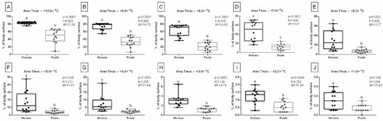 The percentage of multi-colored-annotated pixels (Color pixels) occurrence in the Areas of the highest/maximal temperatures (Tmax) ranged for (A) Tmax-10 °C; (B) Tmax-9 °C; (C) Tmax-8 °C; (D) Tmax-7 °C; (E) Tmax-6 °C; (F) Tmax-5 °C; (G) Tmax-4 °C; (H) Tmax-3 °C; (I) Tmax-2 °C; and (J) Tmax-1 °C. Data in box plots were represented by the lower quartile, median, and upper quartile, whereas whiskers represent minimum and maximum values. Additionally, values for subsequent individuals were marked with dots. Lowercase letters indicate differences between horse and foal groups for p < 0.05. The t-value and df are displayed on each plot.