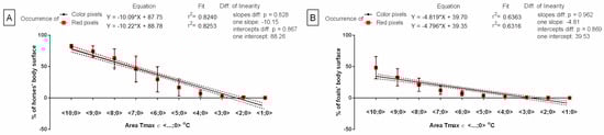 Comparison of the percentage of multi-colored-annotated pixels (Color pixels) and percentage of red-annotated pixels (Red pixels) occurrence throughout ten Areas of the highest/maximal temperatures (Tmax) ranged for Tmax−10 °C <10, 0> to Tmax−1 °C <1, 0>. The comparison was made separately for (A) the horse group and (B) the foal group. Similarity was tested using linear regressions and considered significant for p < 0.05. If the difference between slopes was not significant (p > 0.05), a single slope was calculated. If the difference between intercepts was not significant (p > 0.05), a single intercept was calculated.
