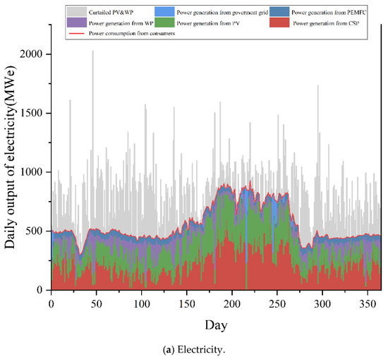PRER is defined as the output of the system to the renewable energy input to the system. Among them, , , , and are the electricity directly supplied to the user with WP, PV, CSP, and PEMFC, respectively. is the hydrogen energy output. and are rest energy in HES and TES, separately. and are the wind and solar radiation resources, respectively.