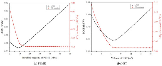 In Figure 15b, the trend of LCOE and CO2 emissions variation with HST capacity is similar to that of PEME. HST mainly functions as a hydrogen energy storage to complement the PEME.